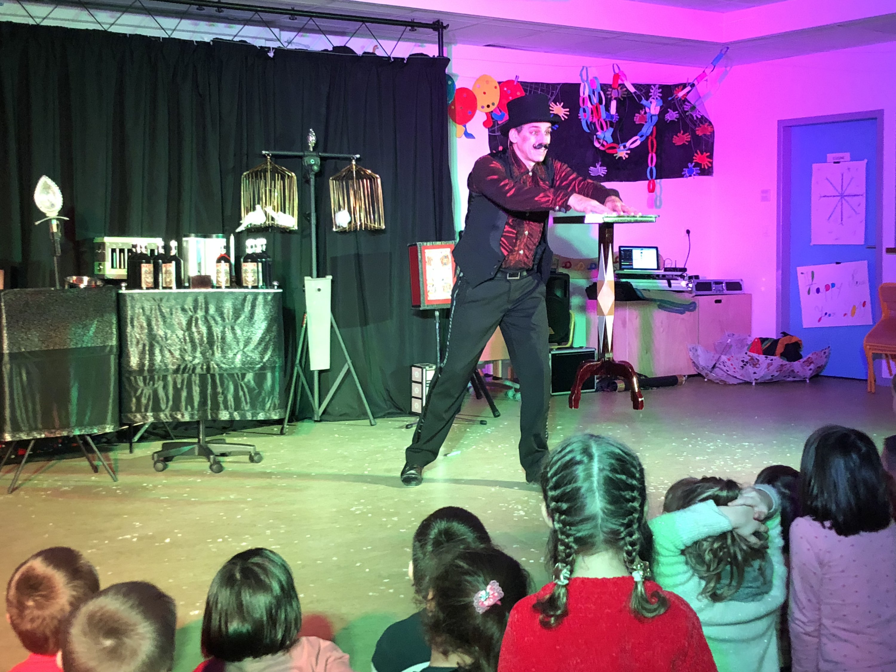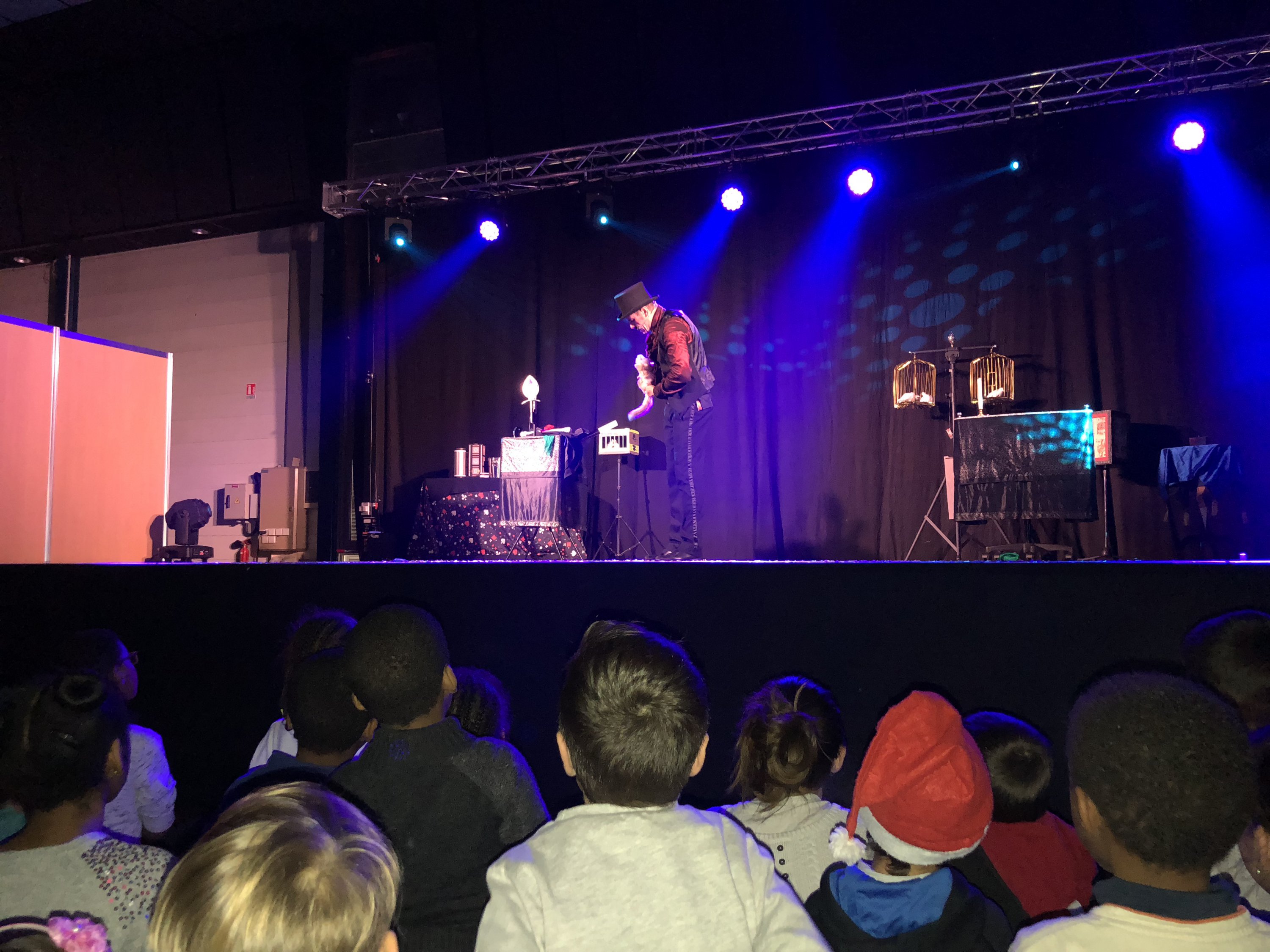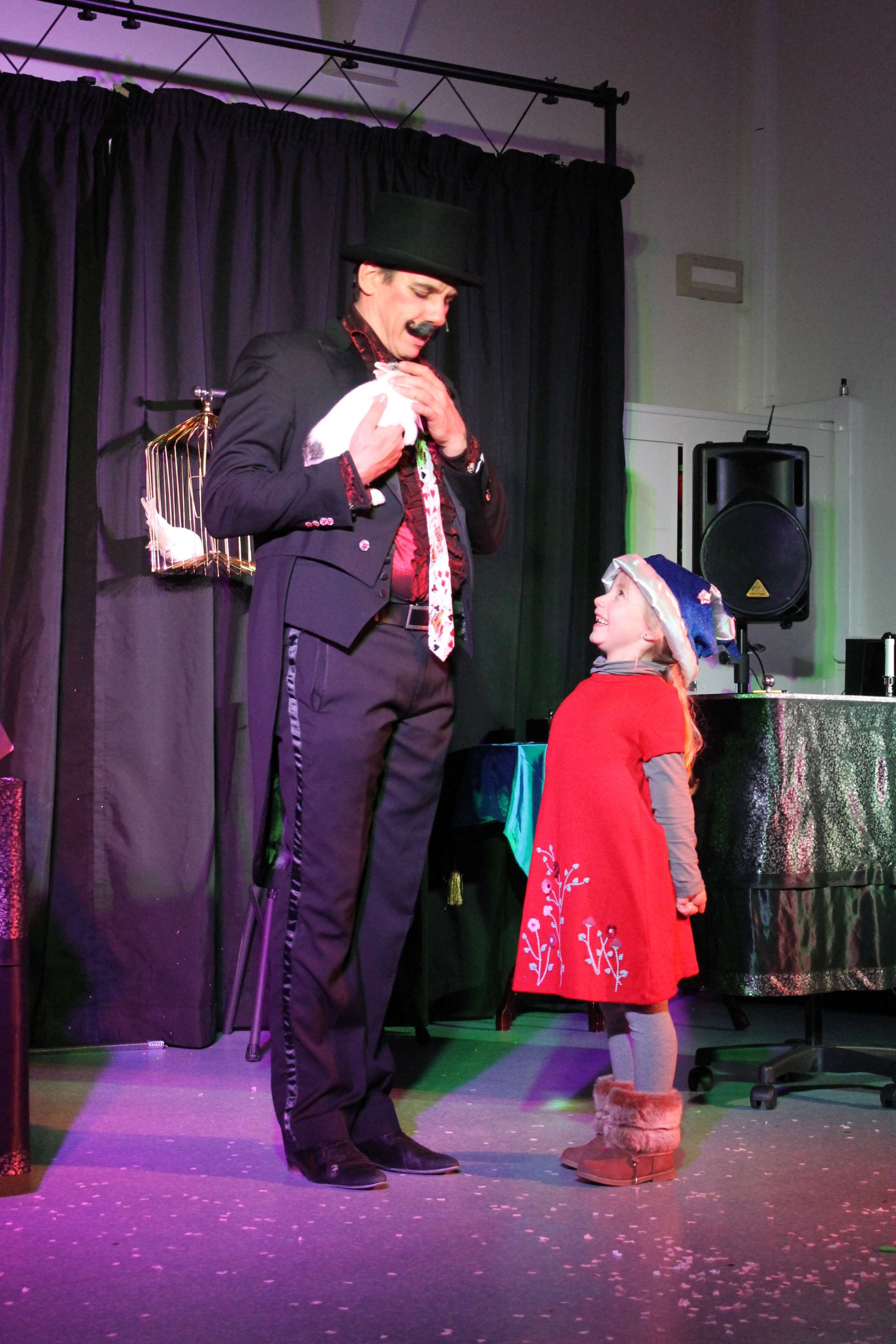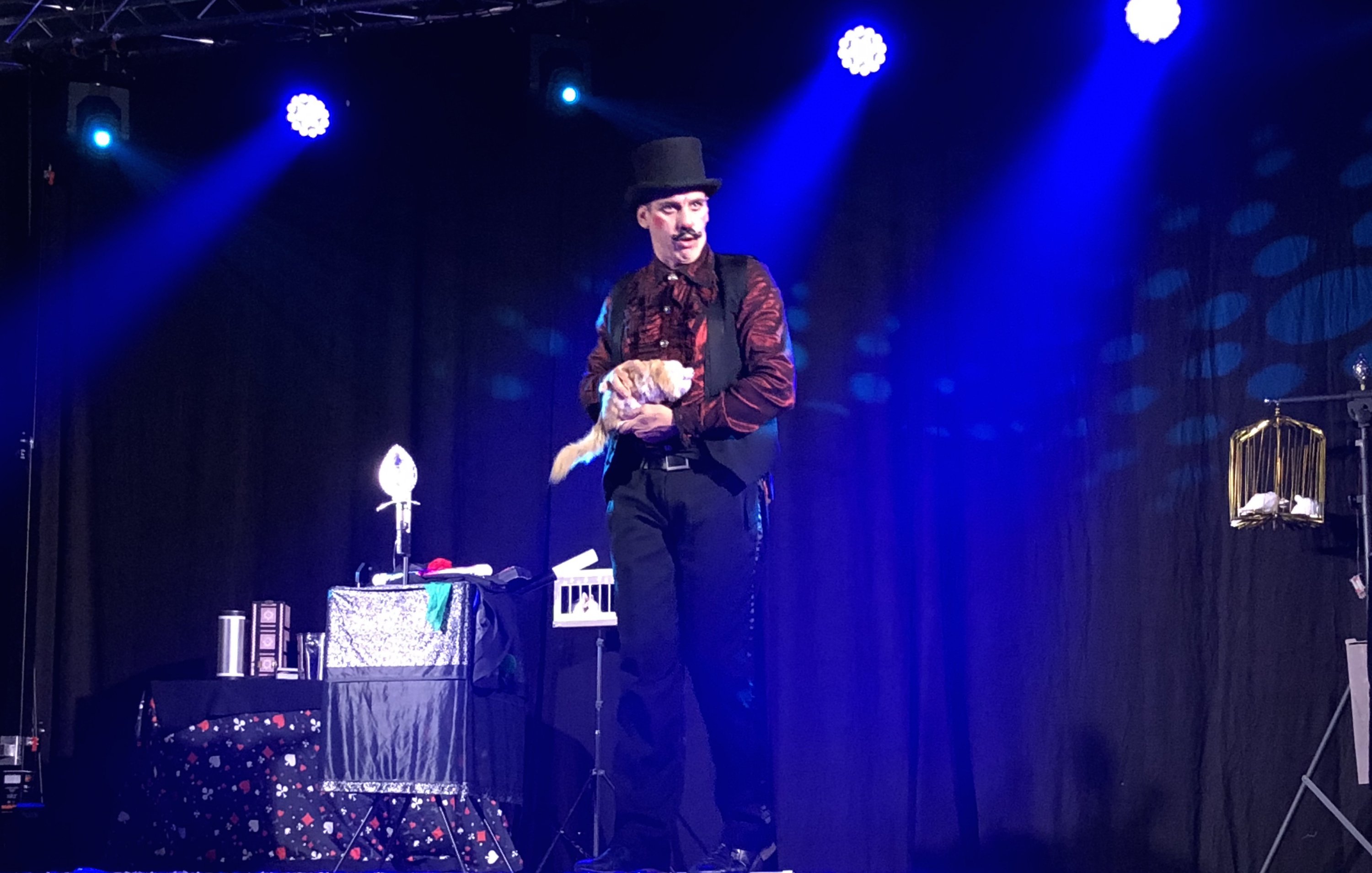 -Magie interactive avec le public, un enfant se transforme pour un moment en magicien et fait apparaître un lapin.