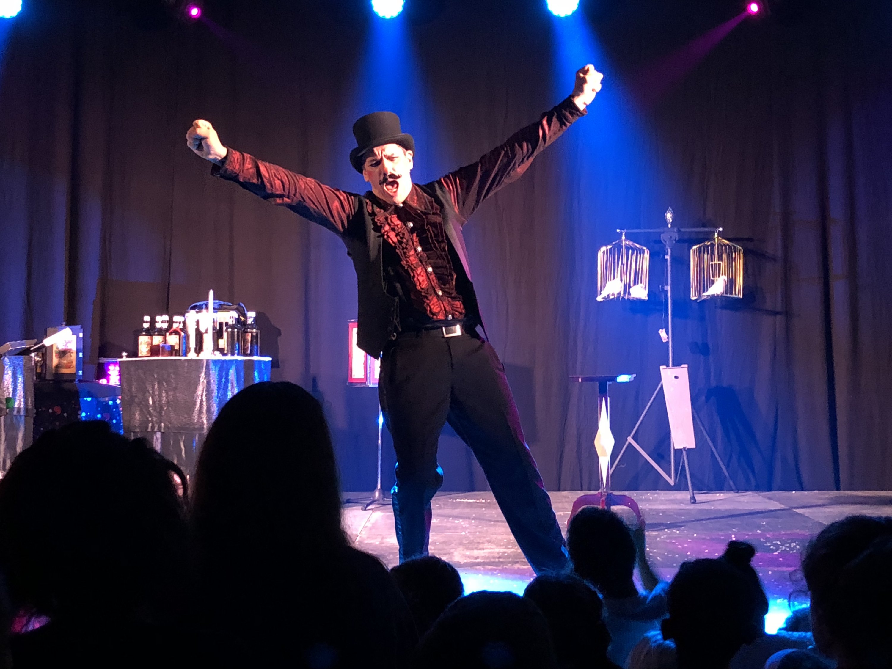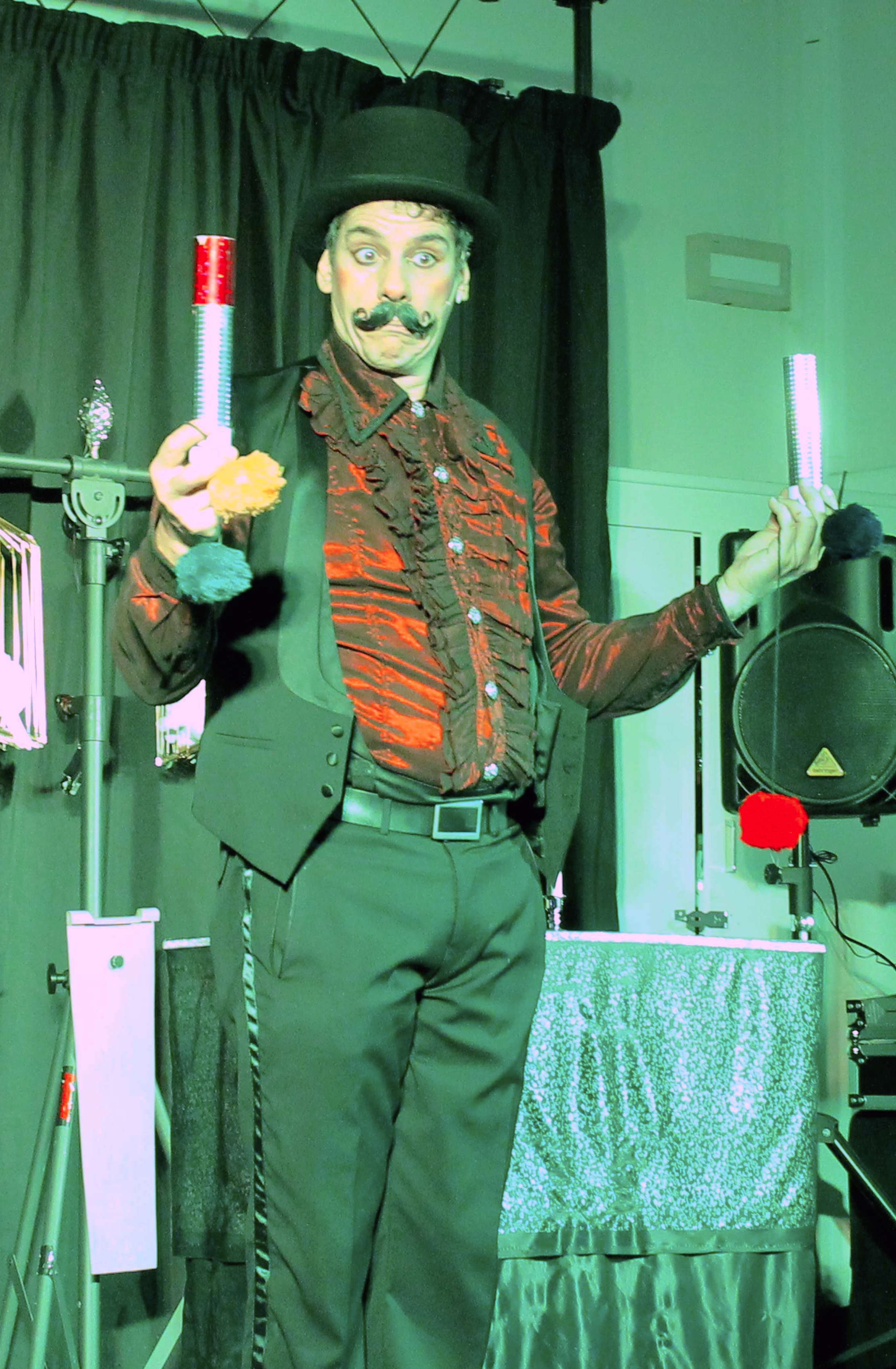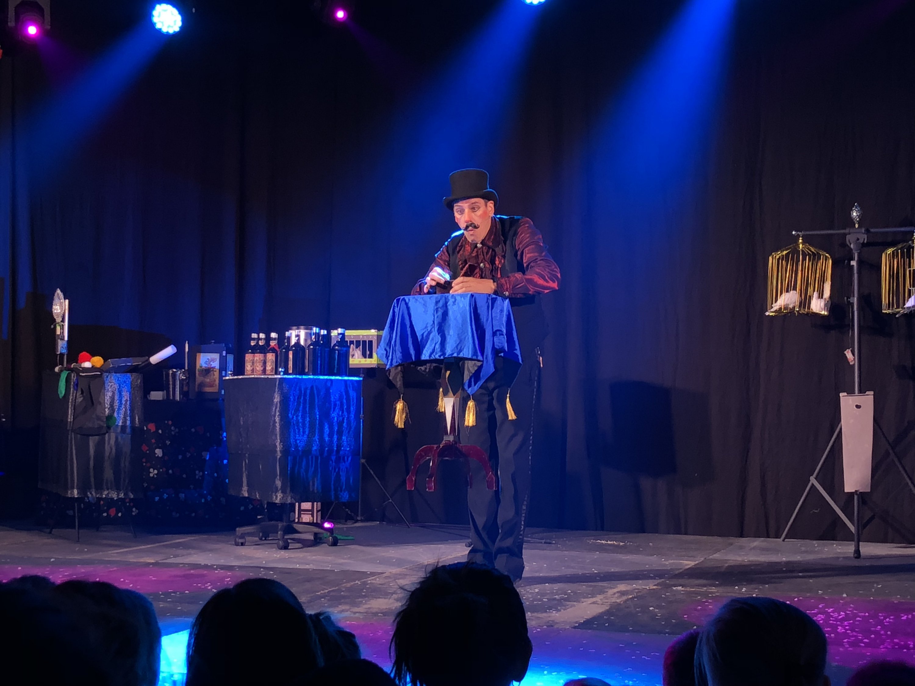 -Magie, apparition de colombes dans une canne en feu, lévitation d’objet, la corde qui traverse le corps, les bougies volantes et pleins d’autres apparitions et disparitions sur une mise en scène burlesque.