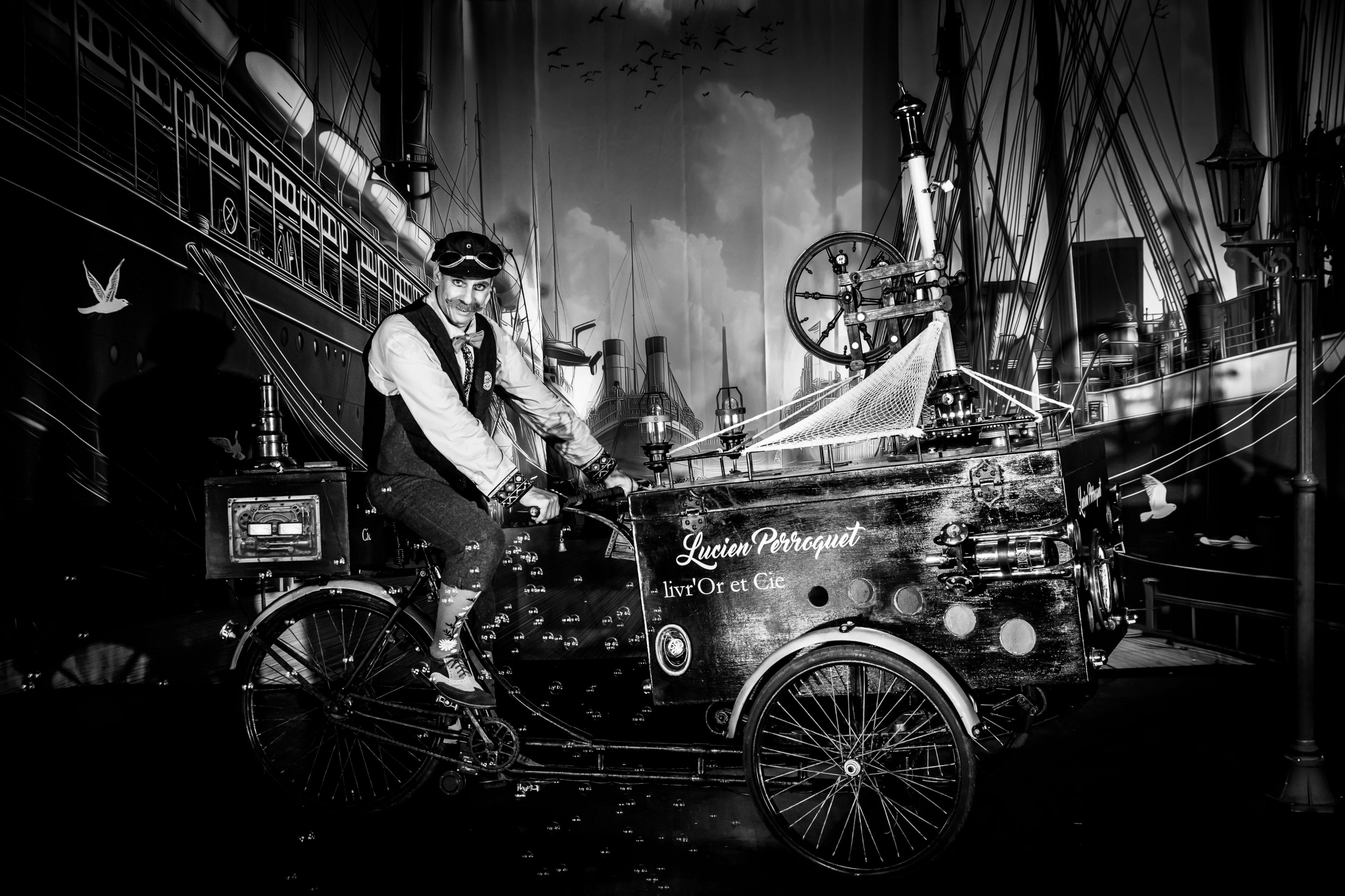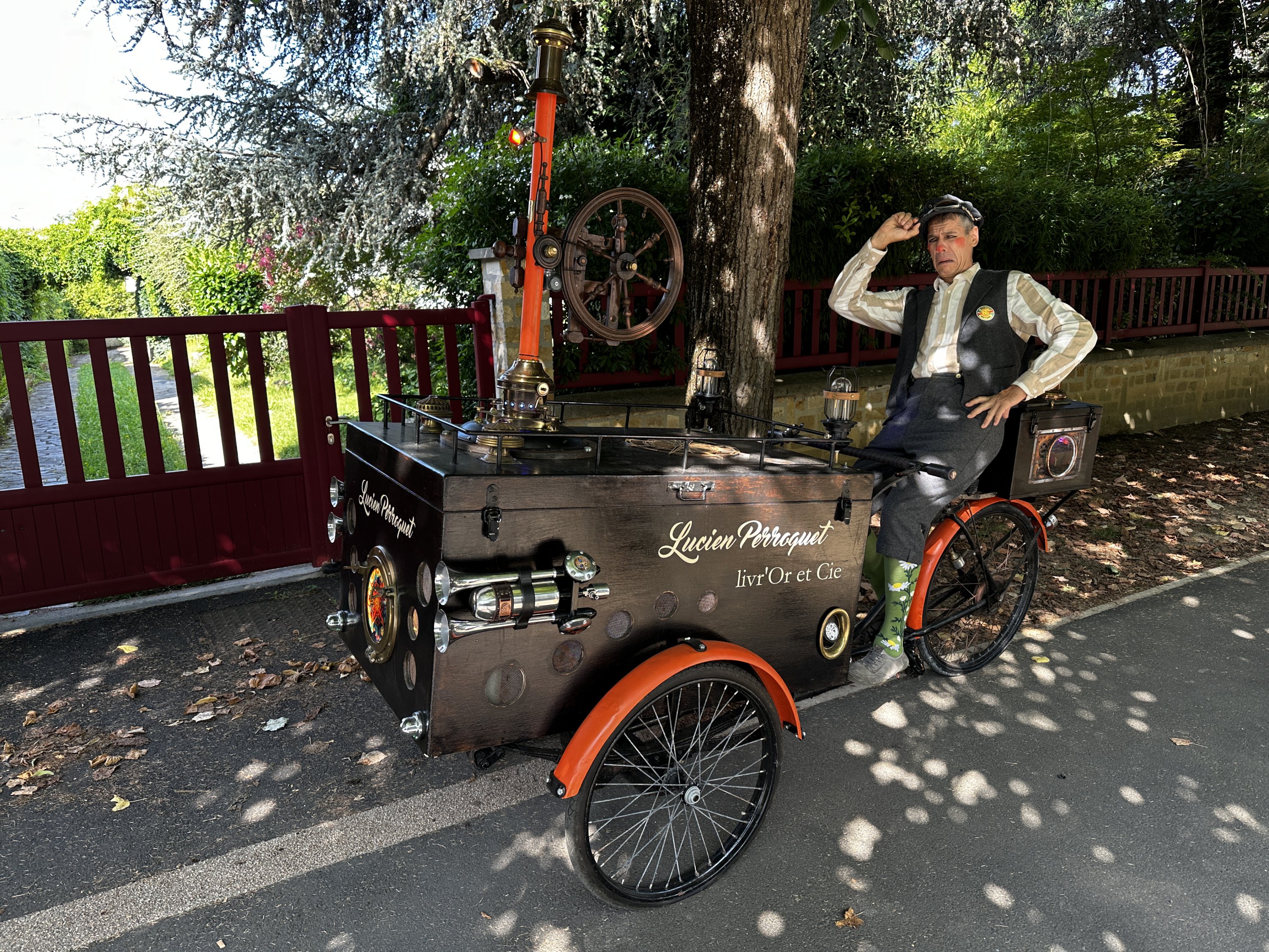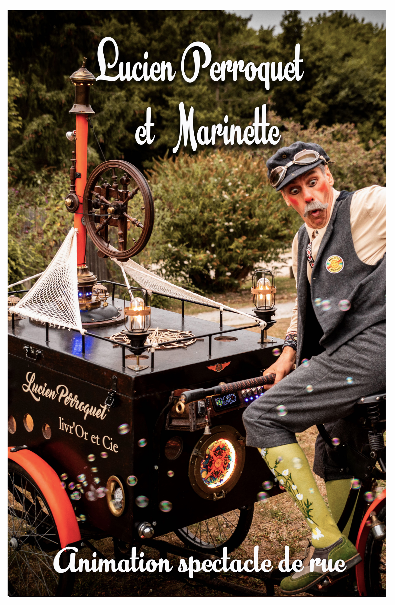 Lucien Perroquet, c'est l'homme qui a fait de la route son océan. Juché sur son vélo triporteur à l'allure de bateau de fortune – un engin insolite baptisé l'Histoires-Mobile – il se présente comme un "livreur d'histoires" captivant. Accompagné de Marinette, son otarie-marionnette espiègle, il invite le public à embarquer dans un univers où les mots sculptent des mondes et où l'imagination est la seule boussole.