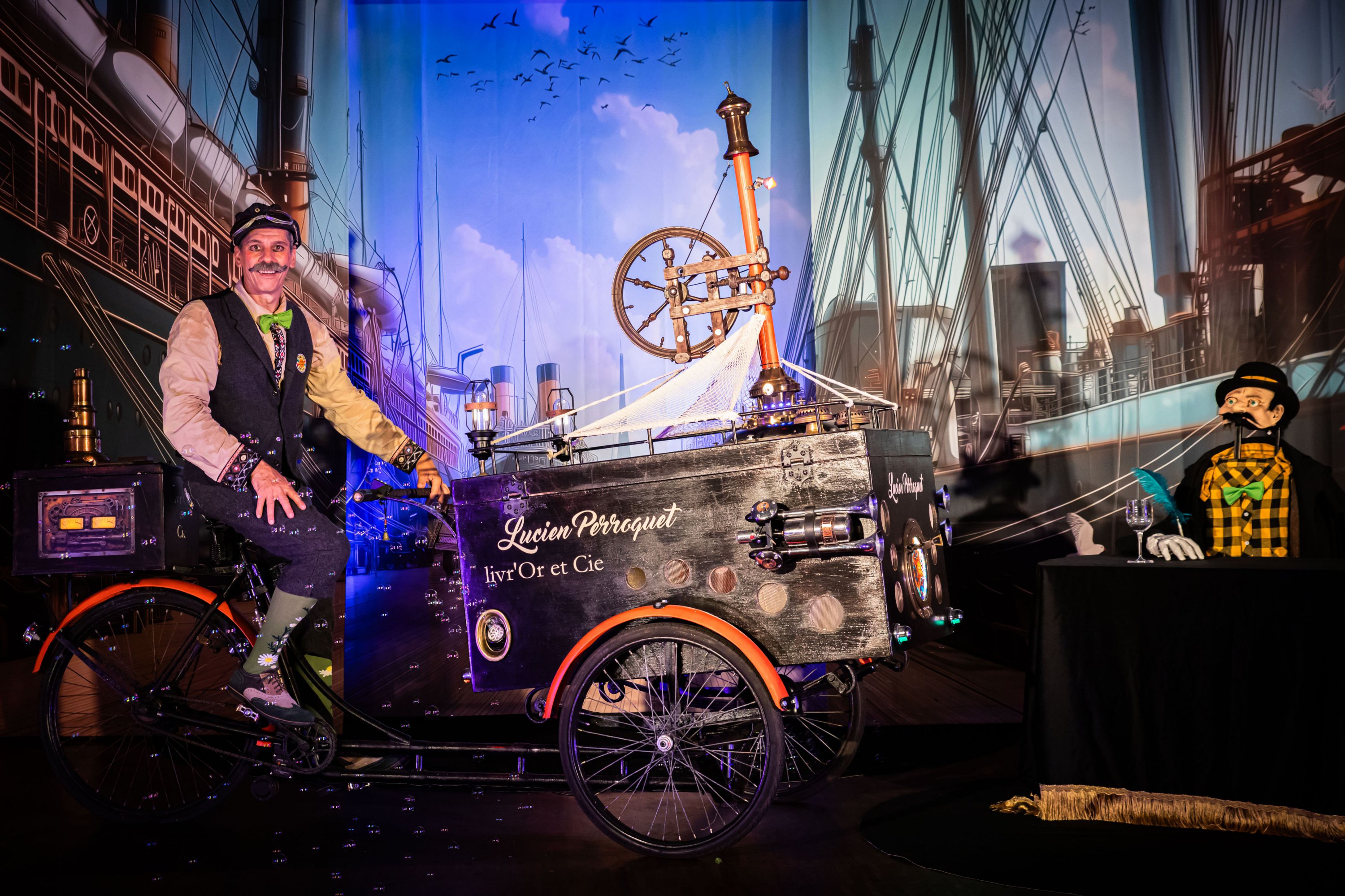 Lucien Perroquet est un livreur d’histoires. Un passeur de mots, un conteur espiègle qui arrive chargé d’un récit rare, précieux, légèrement épicé… Dès les premières minutes, il entraîne le public dans une traversée joyeuse et mystérieuse, là où les frontières entre le vrai et l’illusion se brouillent délicatement.