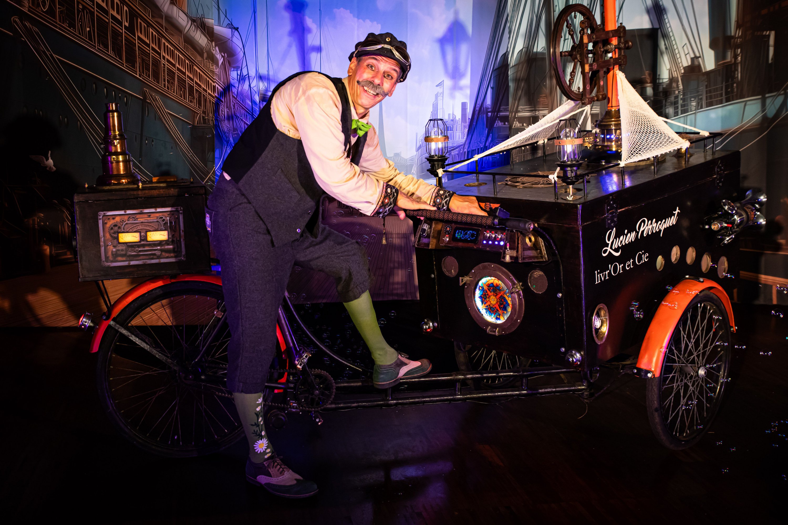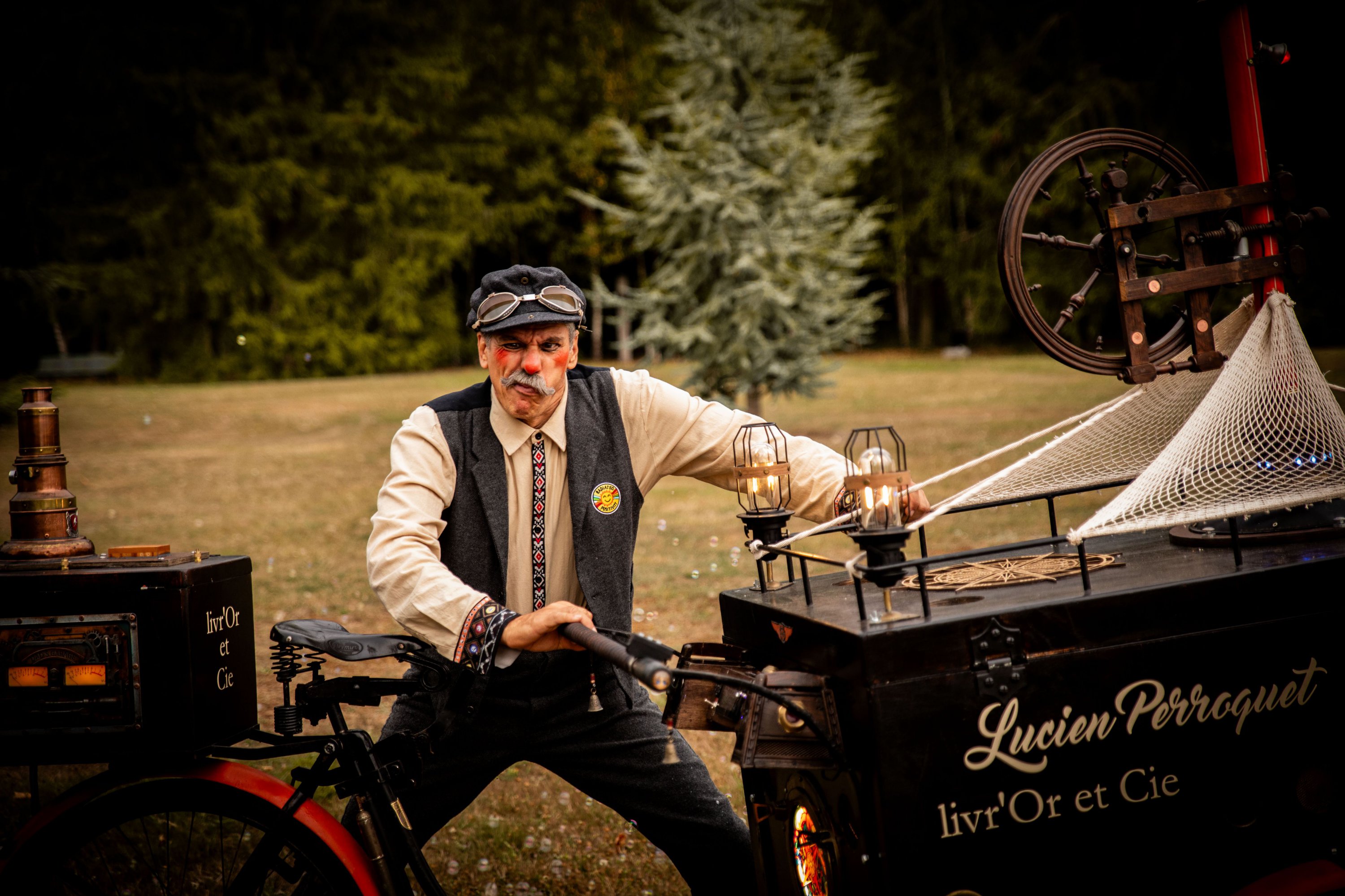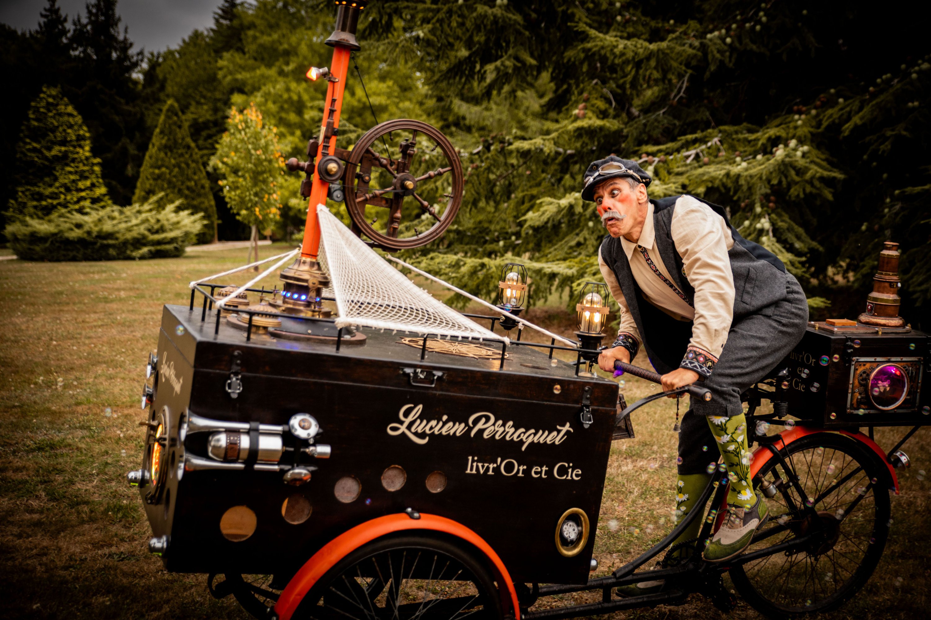 Lucien Perroquet, c'est l'homme qui a fait de la route son océan. Juché sur son vélo triporteur à l'allure de bateau de fortune – un engin insolite baptisé l'Histoires-Mobile – il se présente comme un "livreur d'histoires" captivant. Accompagné de Marinette, son otarie-marionnette espiègle, il invite le public à embarquer dans un univers où les mots sculptent des mondes et où l'imagination est la seule boussole.