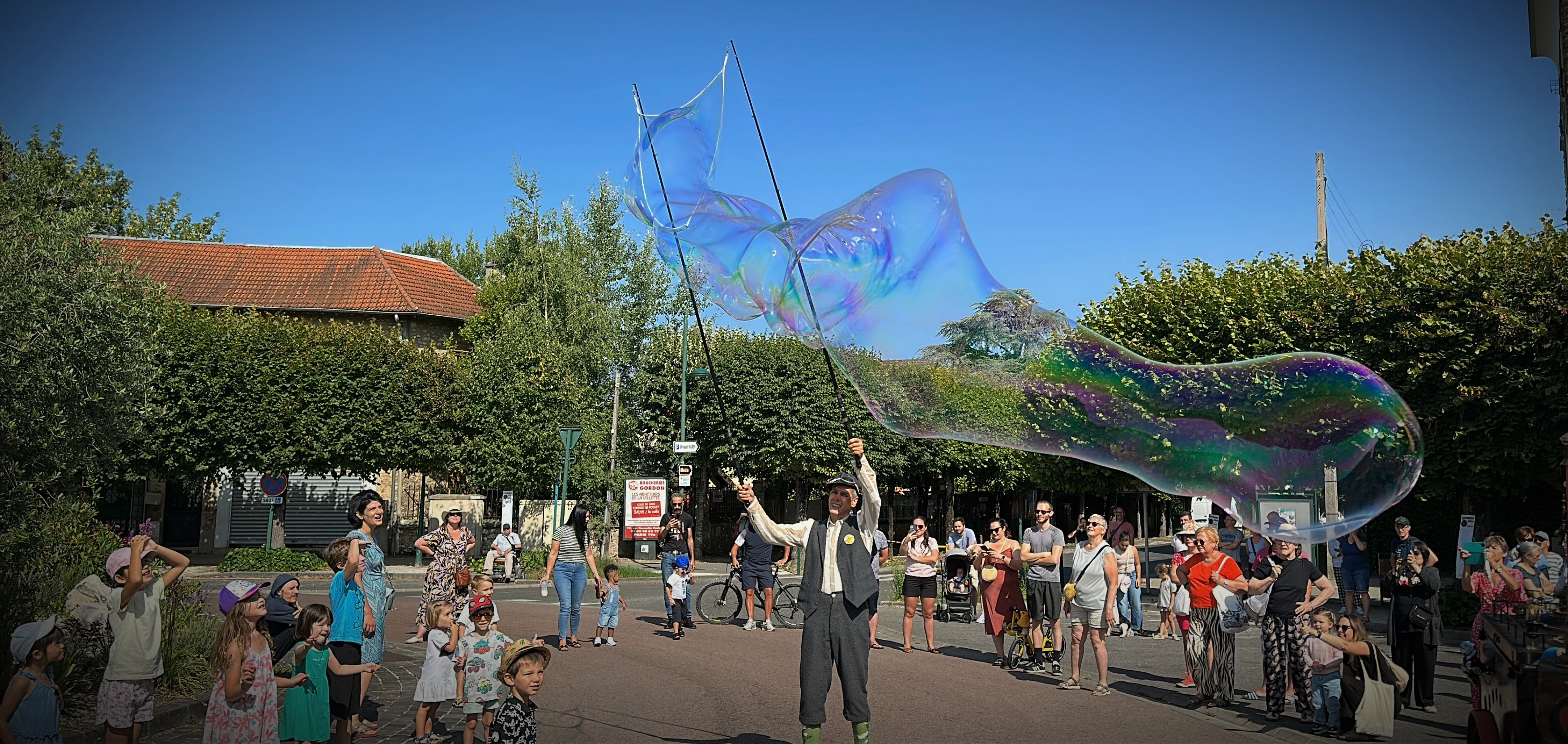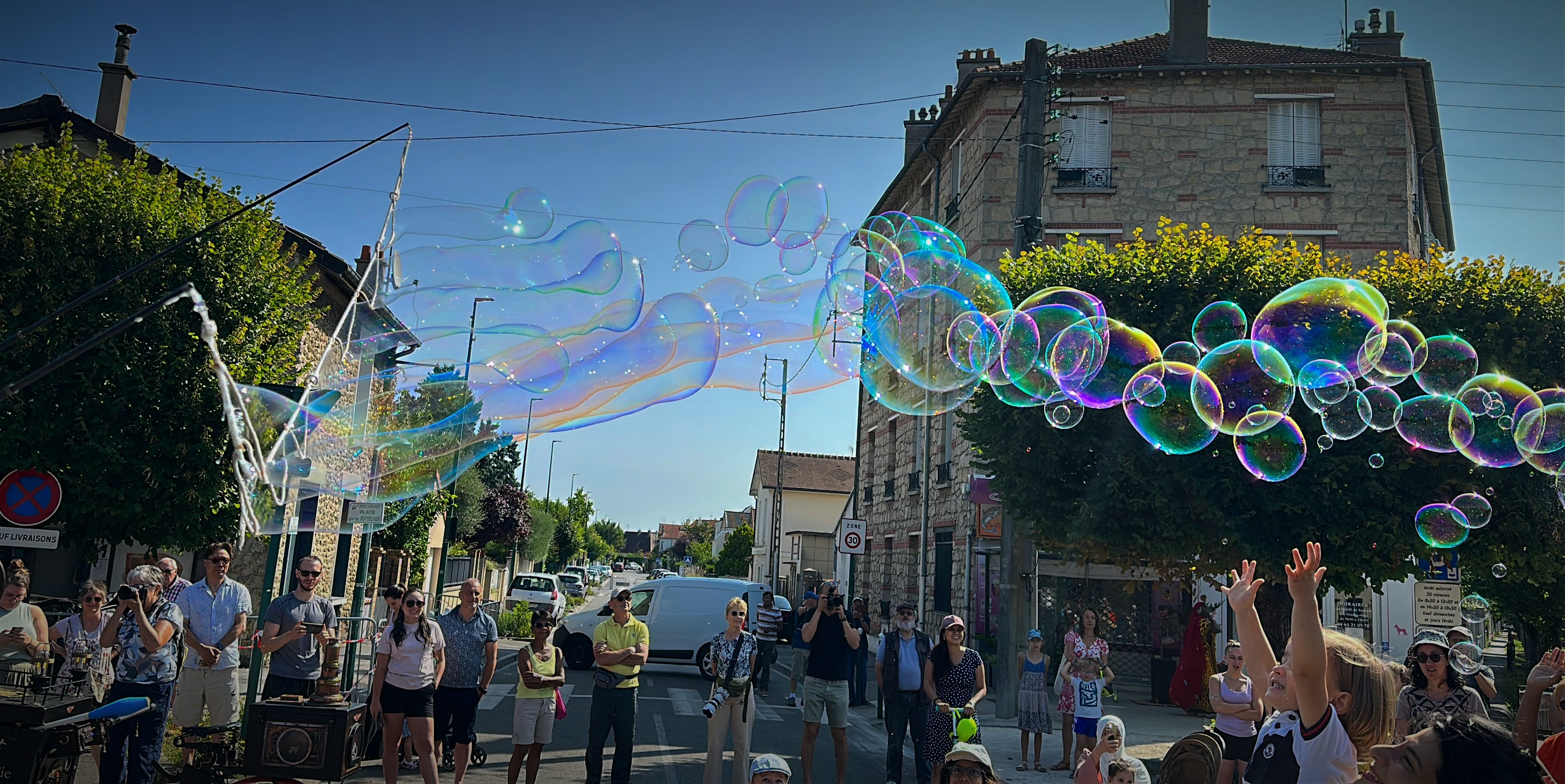 Bulles Géantes : La légèreté et les reflets des bulles créent des décors poétiques et éphémères dans l'espace public.